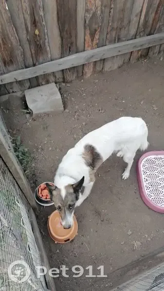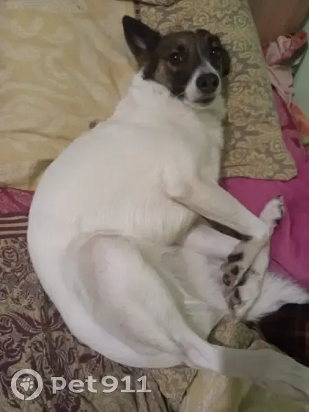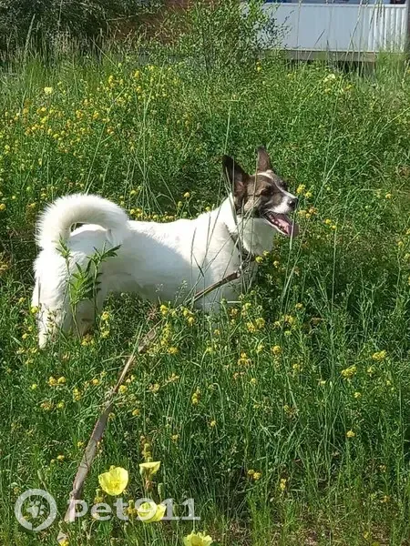 Среднего размера Окрас белый с коричневым пятном на левом боку Коричневые уши и шерсть на лбу и вокруг глаз Стоячие вши и хвост колесом Напоминает лайку На всех лапах по лишнему(прибыльному пальцу)