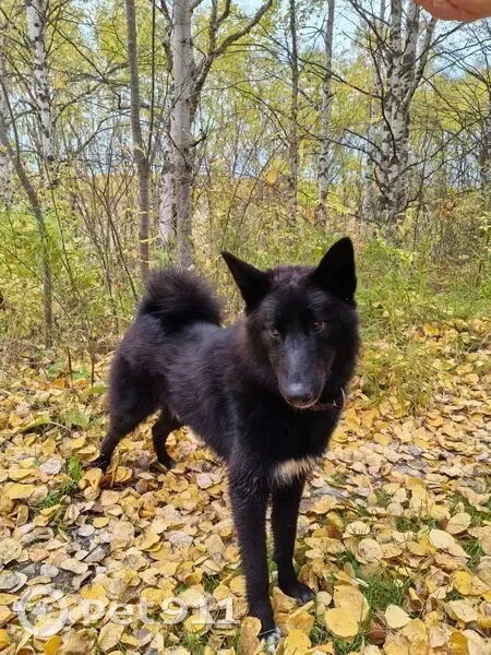 Русско европейская лайка, черный с белым на грудке. Ошейник коричневый кожаный плетеный. Может бегать на полях в районе зеленхоза, детского и взрослого парков.