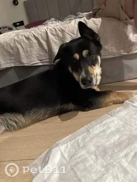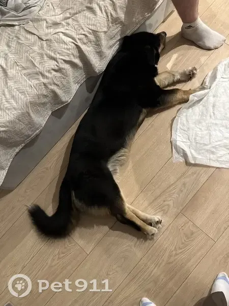 Мальчик, очень добрый, ласковый, к людям идет, в подъезд заходил сам, то есть понимает, что это дом. Брюшко светлое, сам черный, короткие лапки, но сам пес длинный, лапы светлые, хвост черный кончик белый