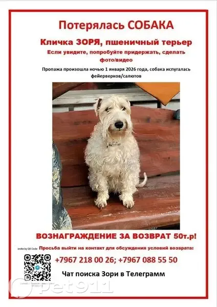 Кличка ЗОРЯ, пшеничный терьер вес 10-11 кг Если увидите, попробуйте придержать, сделать фото/видео Пропажа произошла ночью 1 января 2026 года, собака испугалась фейерверков/салютов