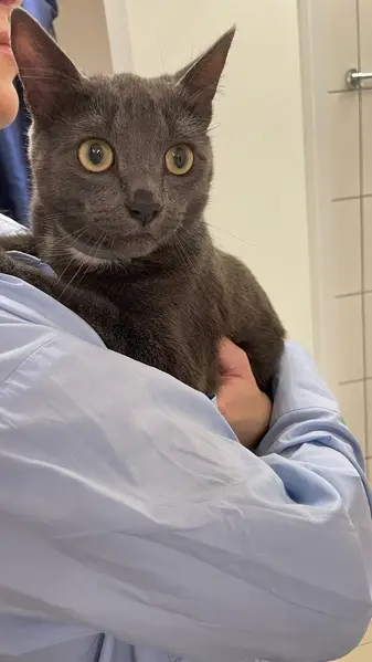 Шерсть серым цветом и немного с коричневым, пузико белый. Игривая, но на улице такое врятли будет, так что будет пугливой Спрыгнула с балкона 1 этажа ночью