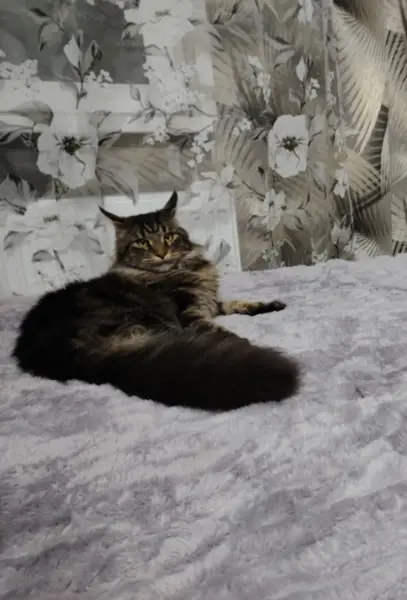 Мейн Кун, возраст 1.5 года. Гулял всегда только во дворе, приучен что дальше ходить нельзя. Пушистый, окрас черно-серый