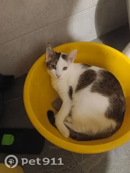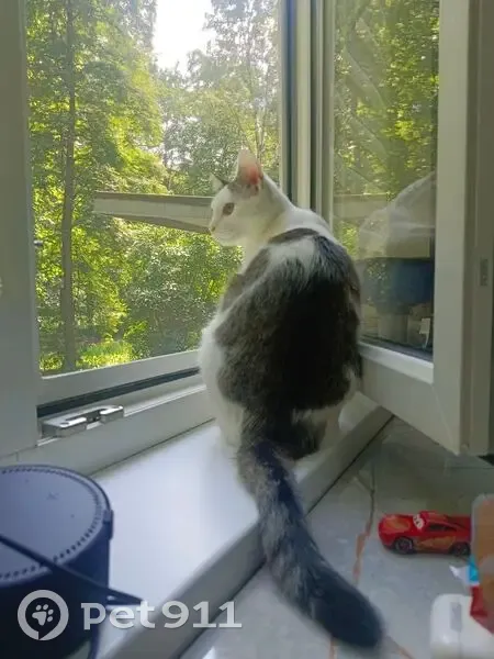 Белый котик , с серыми пятнами на спинке. Один глаз немного мутный , подведён черным . К чужим пугливый , но на руки можно взять , не поцарапает . Потерялся на базе ЗРТО .