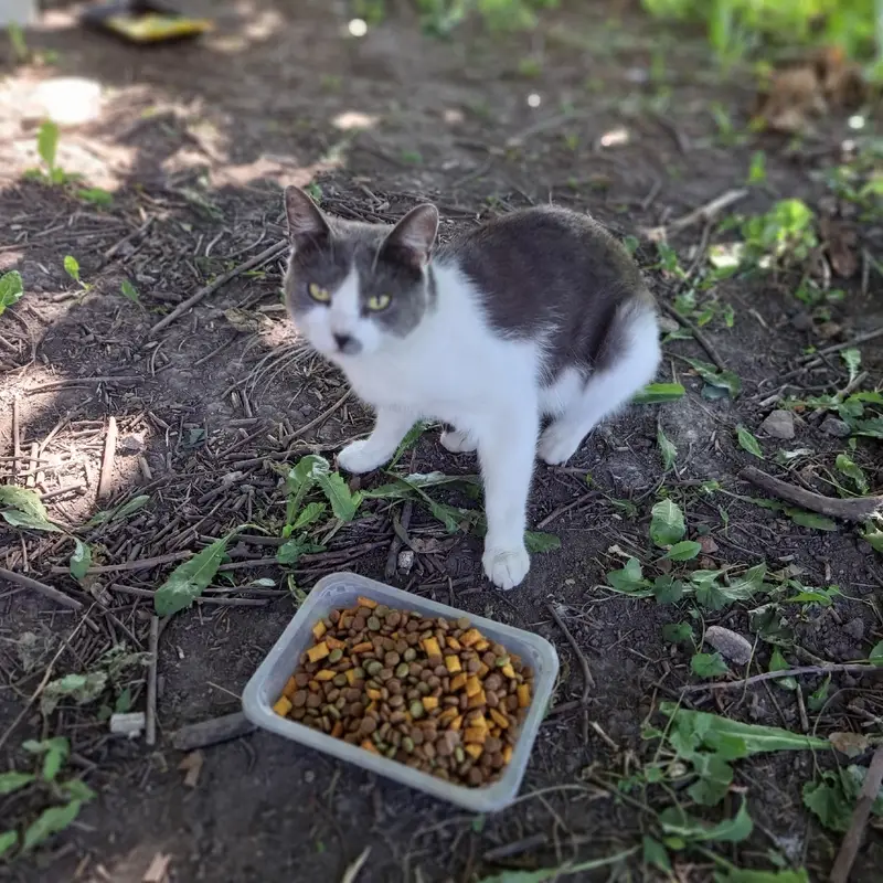 Кот крупный, мордочка частично белая, пузико белое как и лапки. Спина черная. Кастрирован. Игривый и любознательный. Но может бояться незнакомых и убегать. Так же на незнакомца может шипеть, если не сможет убежать. Возможно, можно приманить едой, но легко спугнуть. Собак боится. На имя может не отозваться.