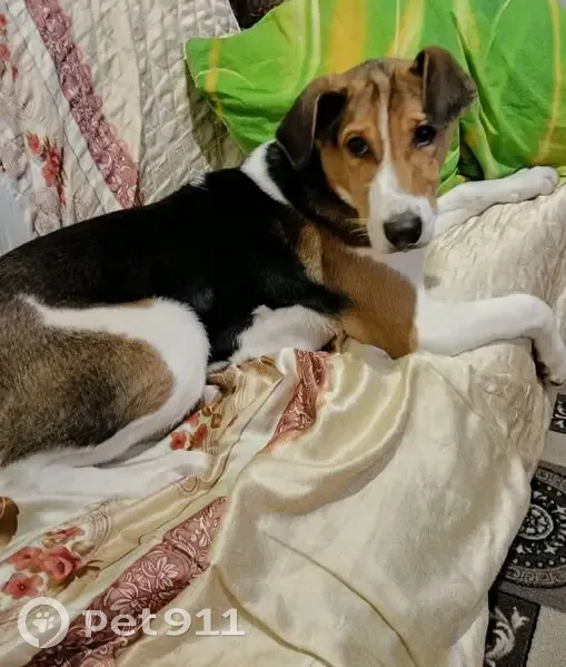 Трехцветный,высокий,гончак .На лапке есть места где нет шерсти.Сбежал с вальера
