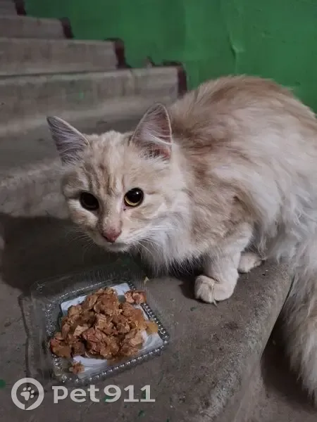 Кот, не крупный, возраст возможно до года, спокойный, пушистый, окрас светый беж или светло рыжый. Видим его во дворе, кормим. На бездомного не сильно похож.