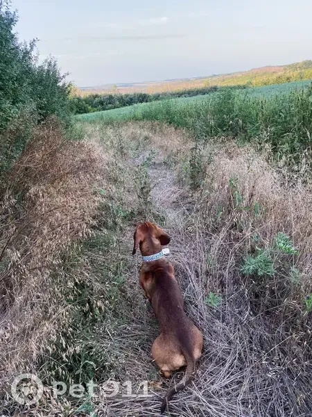 Порода такса,имеет рыжий окрас ,на спинке черноватый , возрастом чуть меньше года, был без ошейника. Испугался работы ПВО ,убежал в сторону молодежного центра.