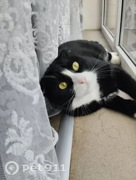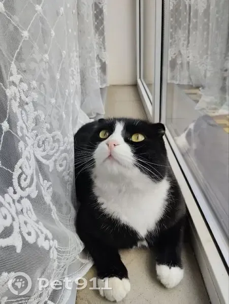 Чёрно-белый вислоухий кот, с желтыми глазами. На задней левой лапе есть небольшая шишечка. Характер шугливый, чужих людей на любит. Вышел во двор частного дома вечером и просто не вернулся.