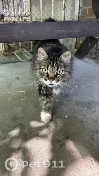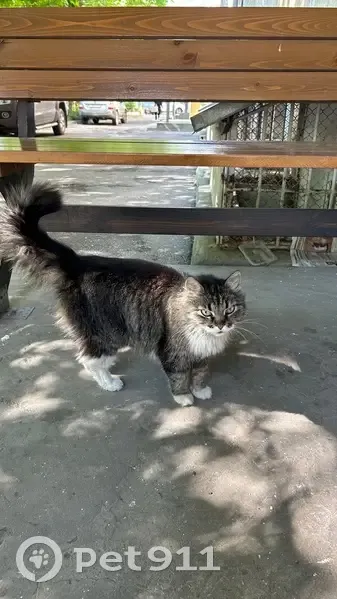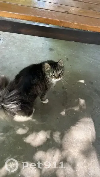 Около недели гуляет, спит около подъезда. По виду это кошечка. Ласковая,людей не боится ,идет за людьми в подъезд. Лапки белые как носочки. Возможно чья-то потеряшка