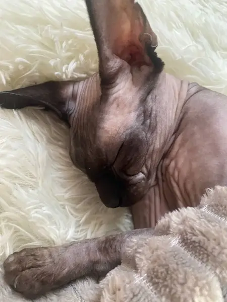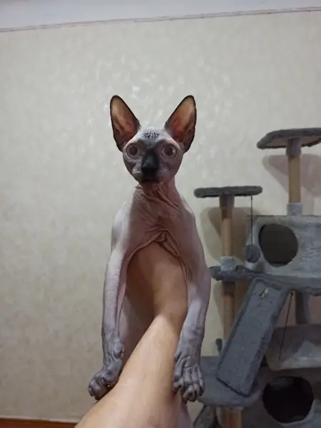Цвет серый, глаза желтые. Точнее сказать невозможно, так как кошечка сильно обгорела на солнце, появились пигментные пятна и только что народившаяся кожа+загар. К сожалению, у кошки оторван хвост и немного край уха подран.