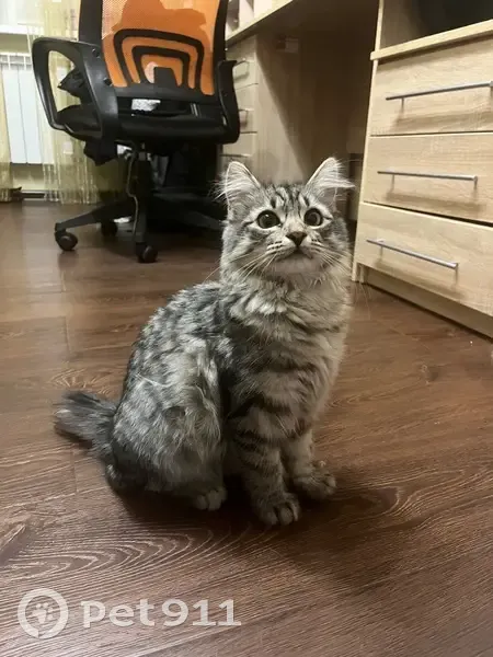 Окрас кошки серый, видно, что домашняя. Хвост короткий. Сидела в подъезде по адресу: 50 лет СССР 3, п5. Пыталась забегать в квартиры. 3 дня сидит уже в этом подъезде. Грязная, промокшая и жутко голодная.