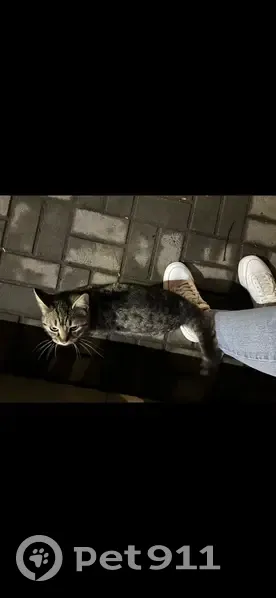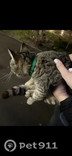 Найдена кошка (кот). Ласковая, контактирует с людьми. Видно, что домашняя. С зеленым ошейником. Кошка возле магазина Магнит, далеко не уходит. Возможно, кто-то потерял.