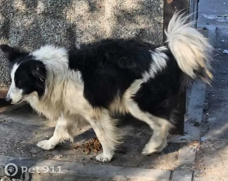 Собака породы Бордер-колли, стандартного черно-белого окраса с белой полосой на спине. Очень пушистый. Бежала по Доломановскому, от Козлова к Мечникова в компании другой собаки.