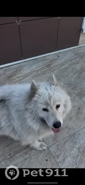 Похожа что это породистый самоед. Хотела зайти в магнит в прохладу, но выгоняли( заглядывает в глаза к каждому прохожему, будто ищет хозяина . Добрая, налила воды, лизала меня, благодарила