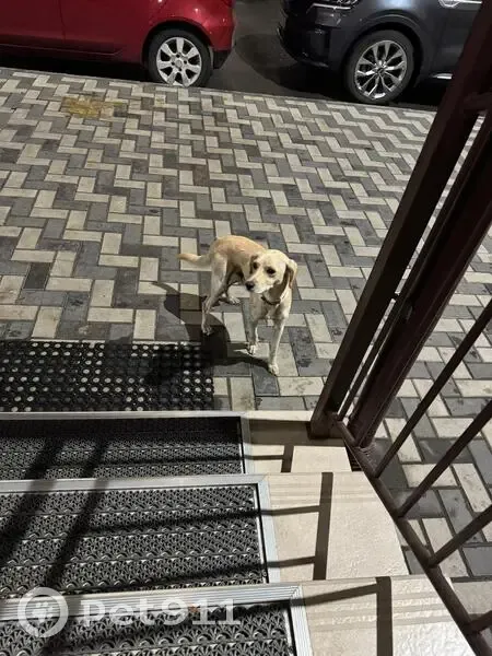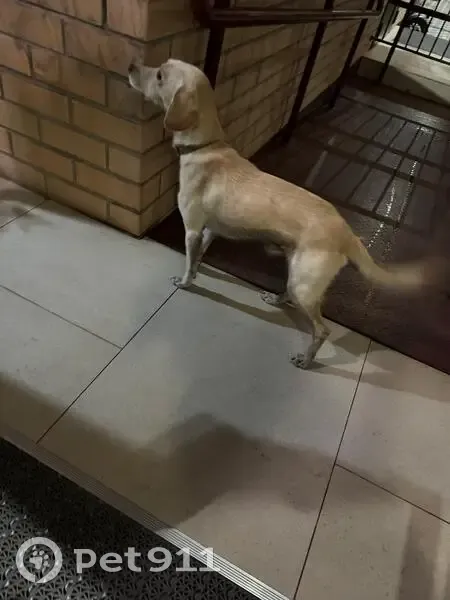 Пёс бежевого цвета, похожий на лабрадора (но поменьше), в старом буро-зелёном ошейнике (адресника нет). Он дружелюбный, немного пугливый и очень-очень худой