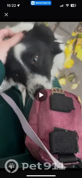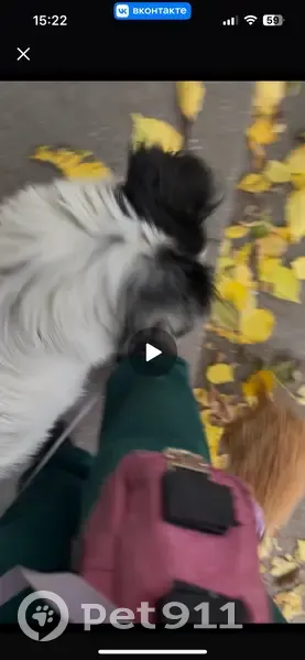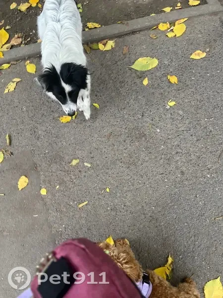 Гуляли с щенком, встретили собаку с зеленым ошейником, без поводка. Ласковый, добрый, ластится. Окрас шерсть белая, подшерсток чёрный, с черными пятнышками