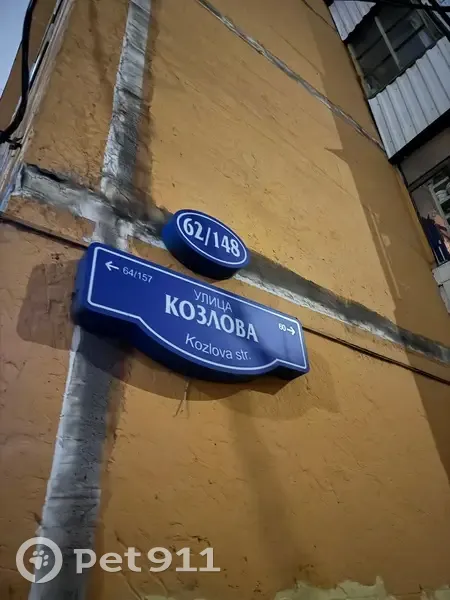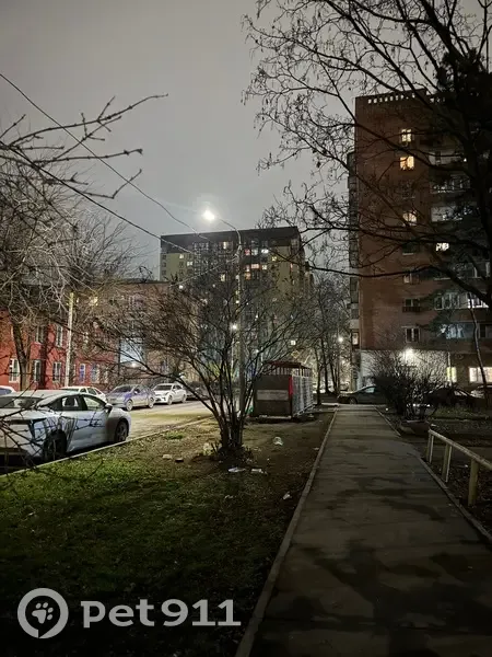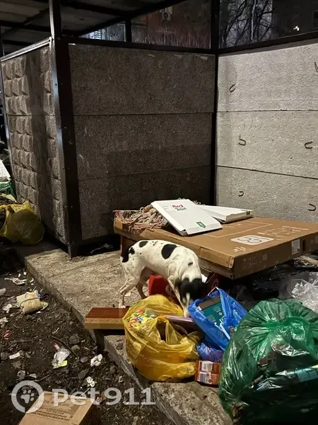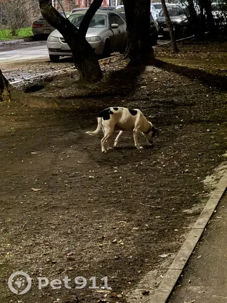 Вышла гулять со своей собакой и в районе 22:10 увидела собаку девочку с ошейником. Белый в черное пятнышко окрас. Вытянутый носик, вислоухая. Очень дружелюбная. Ела из мусорки. Хотела взять к себе на передержку, но она не пошла со мной. Побежала дальше вдоль дома, адрес которого на фотографии