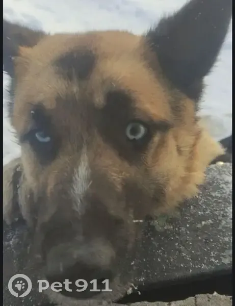 Молодая овчарка,мальчик.Голубые глаза.На одной стороне морды тёмное пятнышко в виде ,,мушки".Найден с ошейником.По виду домашний.Доверчивый,добрый,игривый.