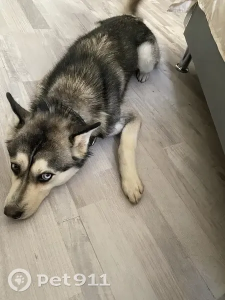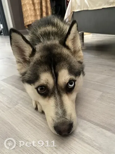 Серо белый мальчик, правый глаз коричнево голубой, левый глаз голубой полностью, черный кожаный ошейник. Бегал возле частного сектора по проезжей части. Нансена, район кольца Страны Советов