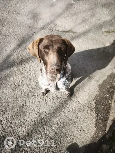 Немецкий курцхаар. Молодая сука. Худая, давно бегает. Без ошейника. +79034012191