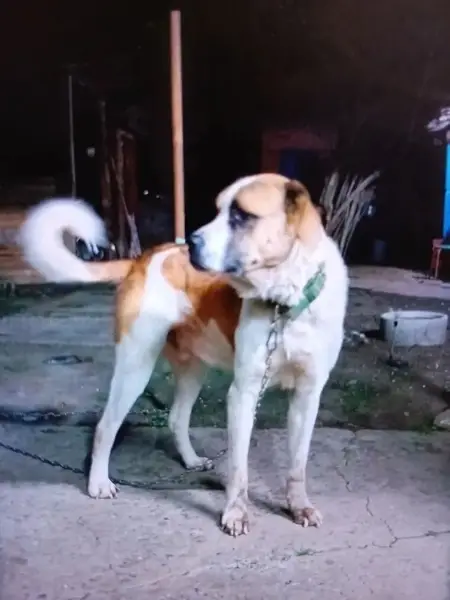 Среднеазиатская овчарка, уши хвост не купирован, глаза большие немного красные, окрас в крапинку и два пятна больших с двух боков коричневые., Ошейник обычный. Возможно сидел на привязи. Лоялен к людям, вероятно хозяин имеет машину. В потере повредил ножку, наступать больно, посмотреть не удаётся. Думаю до 5 лет, мальчик. Относительно спокоен пока. К детям маленьким лояльно относиться, умеет кушать с рук- не хватает. Любит чтобы его гладили и знает себе цену. Связь в любое время.