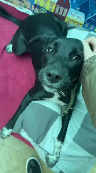 Девочка черного цвета на груди и концах лап белое с черными пятнами. Параметрами большая, но судя по поведению подросток. Выполняет команду "сидеть", но очень не продолжительное время, ласковая, непоседливая