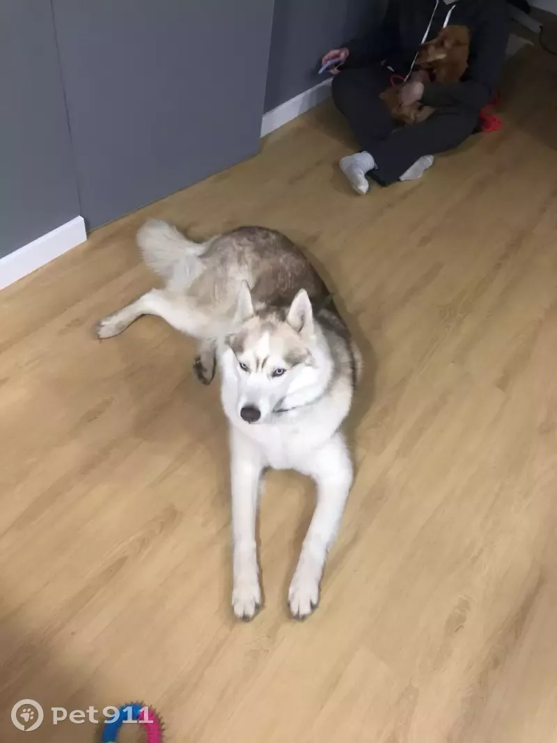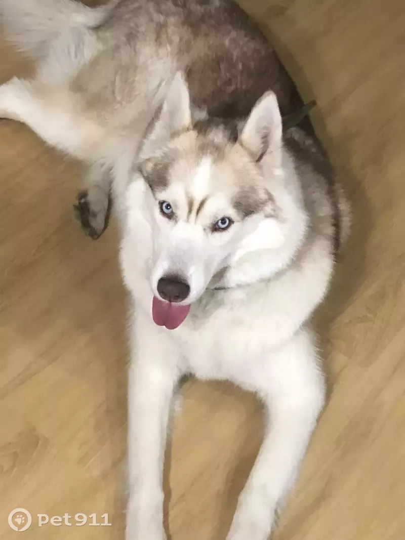 Хаски; девочка; бело-бурая шерсть; голубой, почти белый, окрас глаз. Был одет зеленый широкий ошейник.