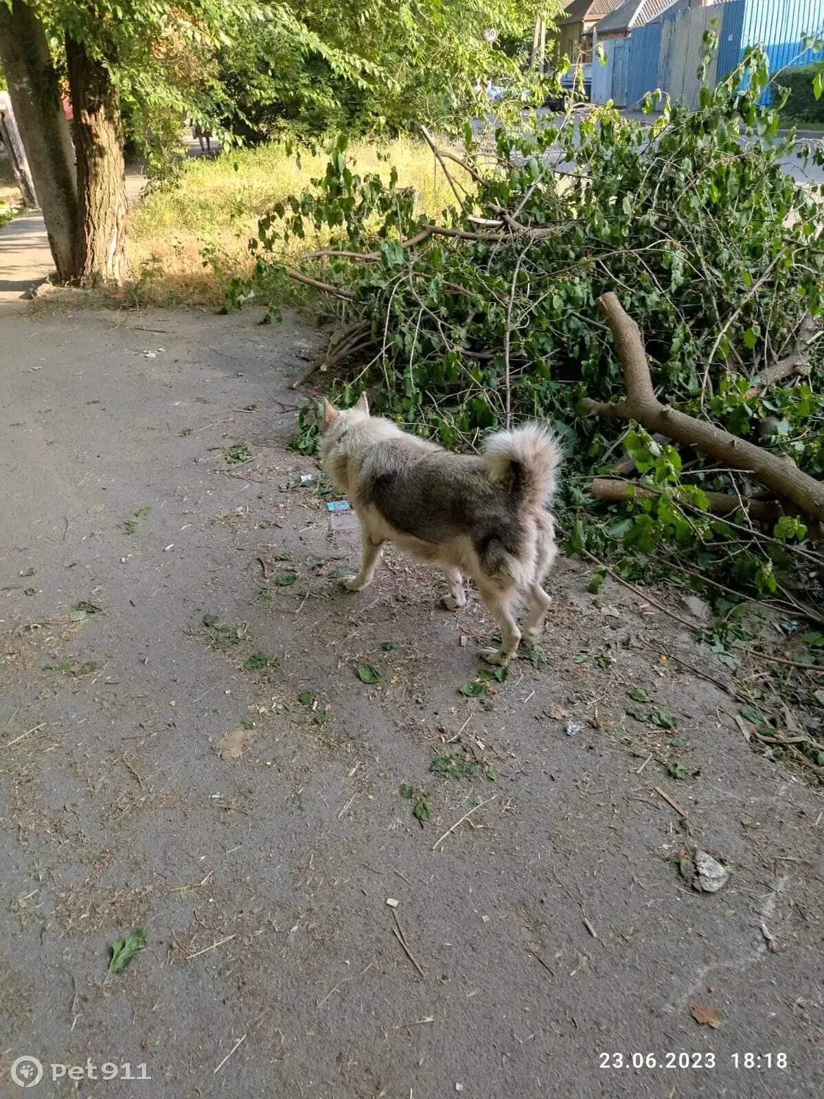 Собака шла со стороны Буйнакской улицы по 38-ой линии. Дошла до мусором и там задержалась. Далее двинулась, либо на Кагальницкую улицу, либо далее по 38-ой. Слегка обвисший живот, возможно девочка. Порода похожа на лайку, хвост закручен вверх. Цвет хорошо виден на фотографии. Имеется ошейник. Наблюдаем собачку уже второй раз за три недели.