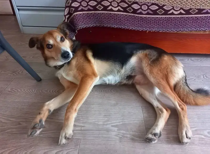 Найдена собака. Окрас черно-рыжий, есть белые пятна. Собака явно домашняя, боится даже котов. Недоверчивая. При этом когда требовалось ее покормить, понимала команды к действию. Знала куда нужно подойти и не была агрессивна.