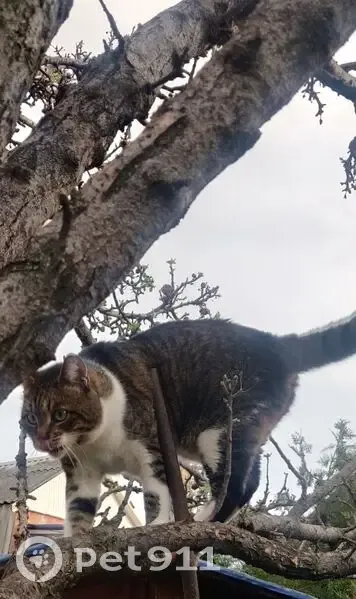 Кот, метис, достаточно большой и упитанный по размеру, 5 лет, кастрированный. Пугливый. Ошейника нет, окрас серый с черными полосками. Белая шея, животик, частично лапки.