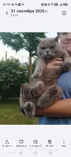 Дмчато серый крупный британец, особые приметы :узкий чёрный ошейник от блох, правый глаз затянут белой плёнкой из-за травмы, над травмированным глазом можно ощутить вмятмну была операция на череп, визуально не заметно. Кот добрый, и доверчивый.