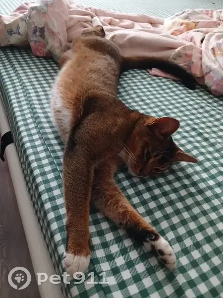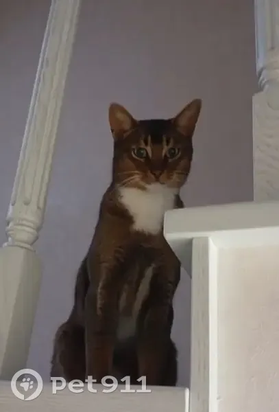 Абиссинский кот (кличка Барсик) с характерным окрасом в коричневых тонах, с белыми пятнами на груди, животе, лапках. Выходил гулять из дома в пределах своего квартала, всегда в течение суток возвращался. В сб, 29го числа, с прогулки не вернулся. Самостоятельные поиски на районе успехом не увенчались.
