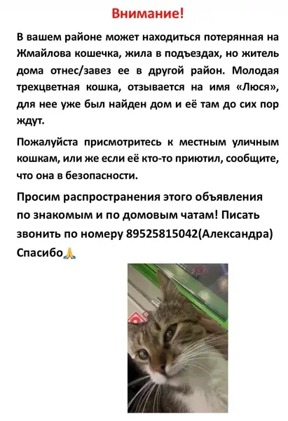 Ее забрал местный житель дома и вывез либо отнес в соседний район, этого «мужчину» найти не получается, по всевозможным объявлениям он на связь не выходит и не хочет внести ясность куда именно он ее отнёс