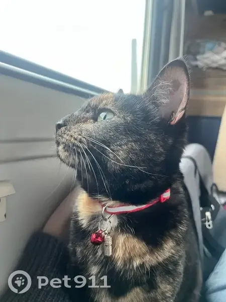 кошка черно-рыжая(черпаховая). Убежала через окно, на ней был красный ошейник