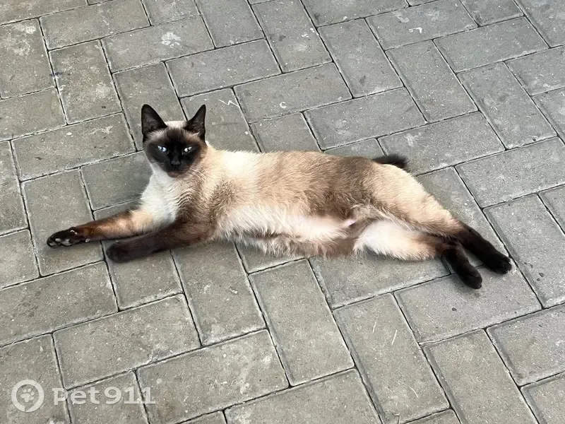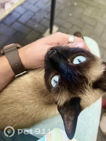 Похожа на сиамскую кошку, хвост купирован (не нами, мы такие зверства не поддерживаем). Хозяин пенсионер и очень переживает за неё.