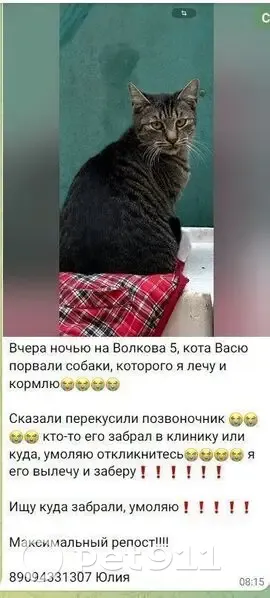 Вчера ночью на Волкова 5, кота Васю порвали собаки, которого я лечу и кормлю Сказали перекусили позвоночник кто-то его забрал в клинику или куда, умоляю откликнитесь я его вылечу и заберу ️ ️ ️ ️ ️ ️ Ищу куда забрали, умоляю ️ ️ ️ ️ ️ Максимальный репост!!!! 89094331307 Юлия
