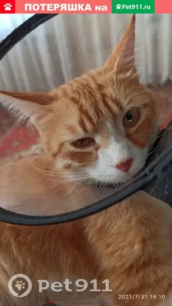 Откликается на кличку Фокс. Рыжий цвет, живот, грудь и маска белого цвета. Должен быть в колпаке. Фокс после операции, из-за этого задняя правая лапа, включая бедро, побрита. На бедре послеоперационный разрез, вчера сняли швы. Может прихрамывать.