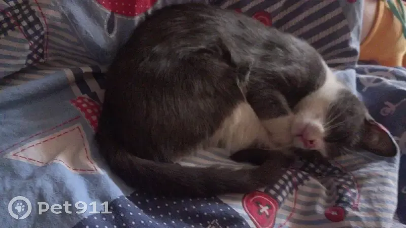 Кот Мурзик небольшого размера, серо - белый, худой