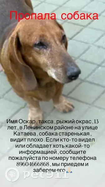 Имя Оскар , такса , светло рыжий окрас , 13 лет , в Ленинском районе на улице Катаева , собака старенькая , видит плохо . Выбежал за пределы двора . Если кто-то видел или обладает хоть какой-то информацией , сообщите пожалуйста по номеру телефона 89604666868 , мы приедем и заберем его