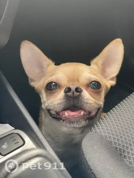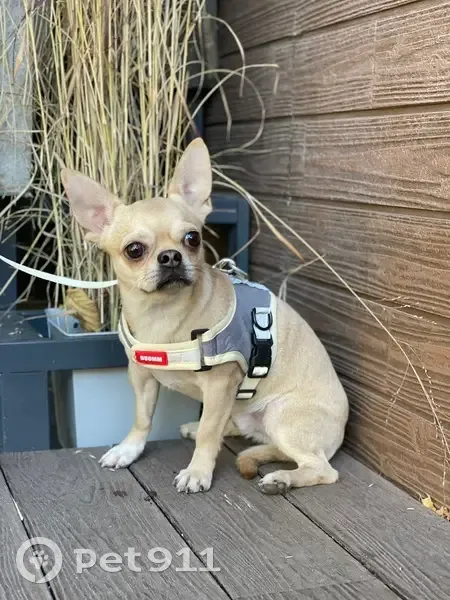 Окрас палевый (светло-бежевый), рост в холке около 30-40см. На шее красный шнурок с жетоном и надписью «гусь за ж*пу кусь» и контактные номера телефонов