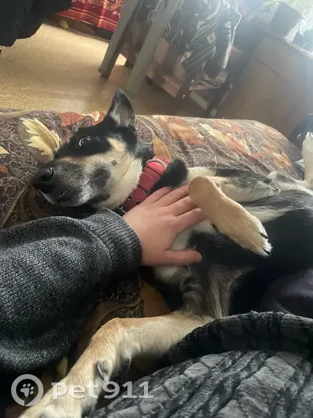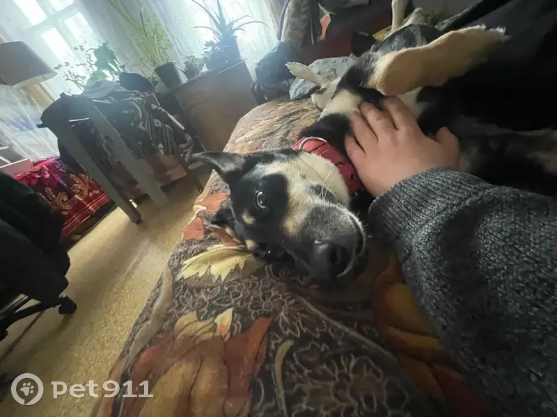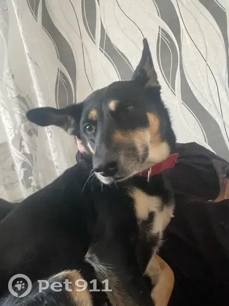 Красный ошейник на шеи, левое ухо стоит, правое лежит. Черно рыжего цвета, родинки на щеках. Очень добрая и ласковая