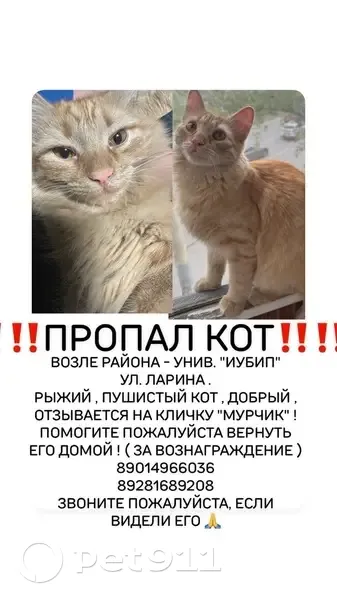 Пропал кот звать Бублик 24 Февраля 10:00 утра...