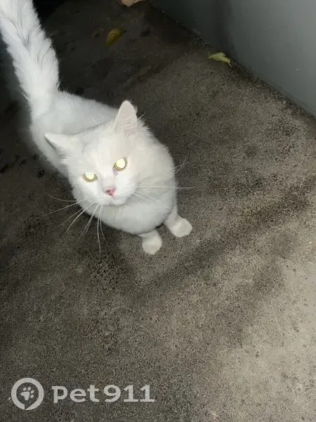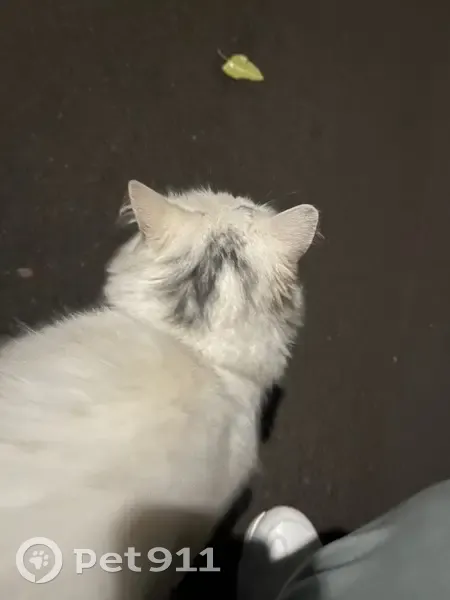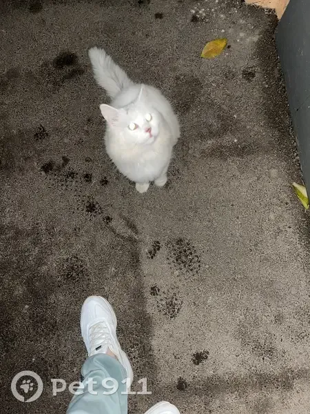Кошка белая, на голове серые пятна. Очень ласковая, очень хочет чтобы ее гладили. Сфотографировать лучше не получилось. Появилась сегодня в нашем дворе
