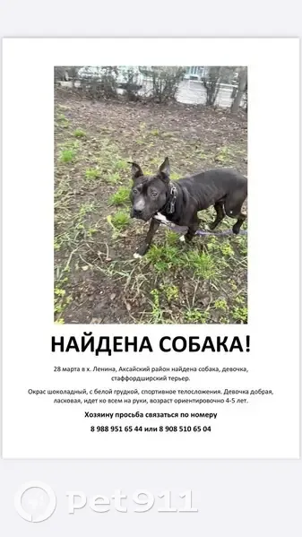 Стаффорд коричневый шоколад, девочка, от 3 до 5 лет. Характер ласковый, воспитана- знает машину, поводок, намордник. Потеряна или брошена у дороги не отходит от места.