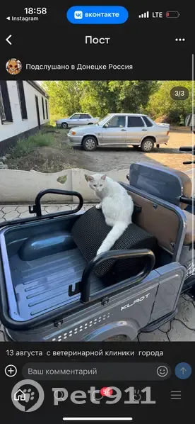 Цвет белый глаза голубые, кошка попала случайно в город Донецк с города краснодона, села к водителю в грузовую машину, водитель обнаружил только в Донецке тут она сбежала