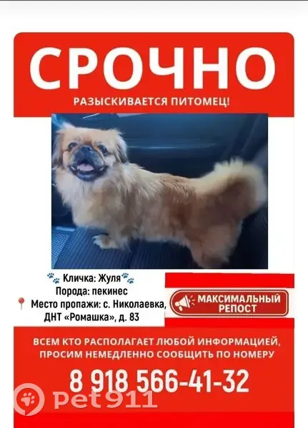 Доброе утро,у нас пропала собака 24 августа днем!!!Порода пекинес. Девочка кличка Жуля. Не агрессивная. Пропала в районе села Николаевка-Троицкое. Она наш член семьи,очень любим и очень переживаем. Кто и что видел прошу сообщить по тел. 89185664132 Алеся. Вознаграждение будет