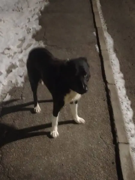 Беспородный, черный с белым кончиком на хвосте, лапки в крапинку, с ошейником, пугливый.