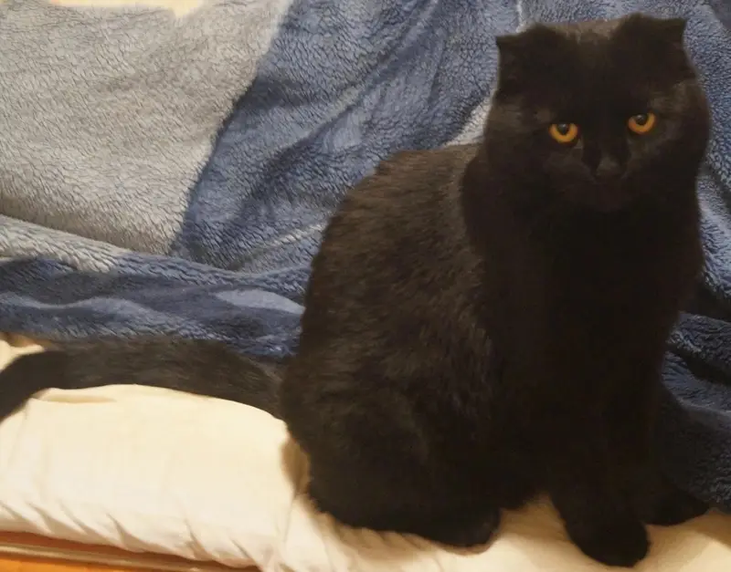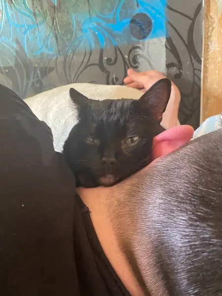 Пришел к нашему дому, и не уходит, кажется котик. Молодой, очень ласковый и общительный, охотно идет на руки. Черный, но на груди немножко беленькой шерсти. Большие зеленые глаза.