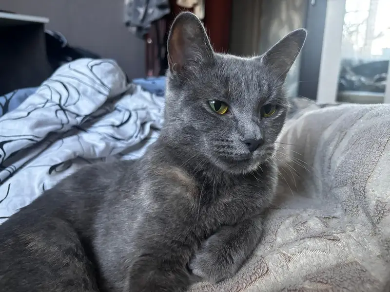 Длинная тёмно-срерая шерсть, янтарные глаза, дружелюбный и ласковый, легко идёт на контакт