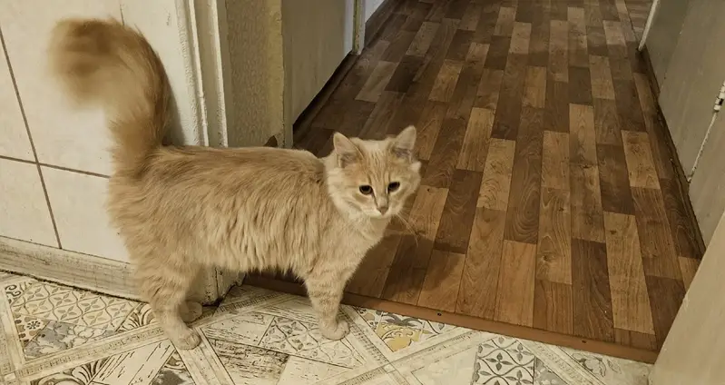 На пересечении Московского шоссе и ул. Юбилейной найден кот. Сидел зашуганный на проезжей части. Персиковый, вислоухий мальчик, чистенький, не кастрат, похож на метиса. Синий ошейник. С домашним котом сильный конфликт, можем придержать не надолго совсем.
